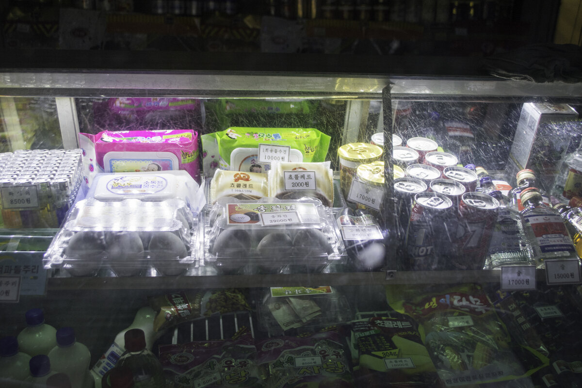 Мы побывали в ресторанчике рядом с Пхеньянским вокзалом и прямо там же перед обратной дорогой в гостиницу я сфотографировал витрину киоска с едой и напитками. Как и положено, рядом с вокзалом цены всегда завышены. Заранее извиняюсь за качество фотографий, на дворе была ночь, гид нас традиционно поторапливала... Посмотрим поближе... :-) Одноразовые зажигалки. По курсу обменника в ТЦ "Кванбок" - 8330 вон/доллар - одна зажигалка стоит 1,02 доллара, или по сегодняшнему курсу ЦБ 64,82 руб/доллар - 66,12 руб. Солёные (маринованные) яйца. Упаковка из 6 шт. стоит 3,48 доллара или 225,57 руб. За коробкой с яйцами виднеются шоколадки по цене 2000 вон/шт, или 0,24 доллара, что составляет 15,56 руб. Банки с кофе и женьшеневым чаем. Ценник разместили именно на женьшеневом чае. Одна банка напитка стоит 2,04 доллара или 132,29 руб. В яркой упаковке влажные салфетки местного производства. Стоимость упаковки 1,2 доллара или 77,82 руб. И, наконец, самые нужные в дороге позиции ассортимента :-)