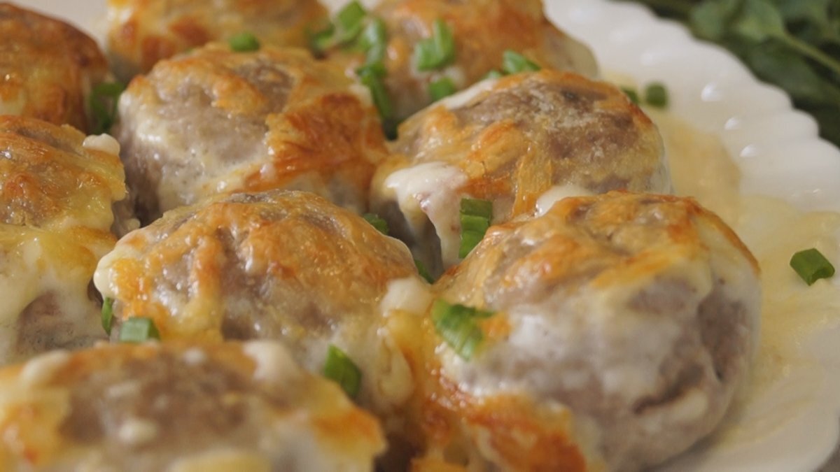 В сливки всыпать муку и тщательно размешать.Залить фрикадельки,посыпать тёртым сыром и поставить в духовку при 220 градусах до готовности.