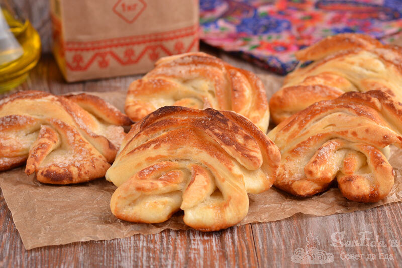 Вкуснейшие плюшки с сахаром из дрожжевого теста. Тесто замешиваю простым способом на воде с добавлением сухих дрожжей, сахара, соли и растительного масла. Оно подходит за 1 час. Чтобы плюшки получились красивыми, придаю им форму простым методом. При запекании они становятся очень ароматными с хрустящей корочкой.