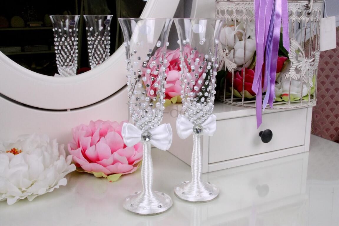 В списке дел при подготовке к свадьбе обязательно должен быть пункт, касающийся свадебных бокалов. Это важные атрибуты праздника, которые всегда в центре внимания. Они сопровождают молодоженов в ЗАГСе, участвуют в фотосессии и являются неотъемлемой частью торжественного застолья. Поэтому украшение бокалов на свадьбу своими руками должно быть в приоритете у будущих супругов. Ленты, стразы и бисер Можно украсить бокалы на свадьбу лентами и стразами. Сделать такое украшение своими руками просто. Необходимо только подобрать красивые и небольшие стразы. Они будут выгодно подчеркивать изящество стекла и заставят его сиять. Интересно будет смотреться фантазийный рисунок из бисера, элементы в виде сердца, свадебных колец или инициалов молодоженов. Ножки могут быть красиво перевязаны синей и белой лентой, или любыми другими цветами, соответствующими тематике торжества. Стоят такие элементы декора недорого. При правильном использовании и удачном подборе украшения могут стать изюминкой вечера, н
