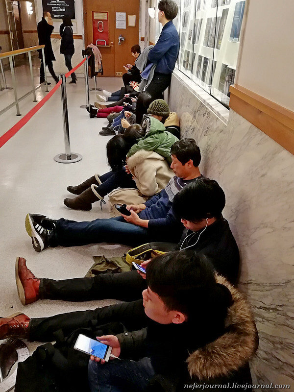 Народ стал прибывать. Нас запустили дальше, я пересела на подоконник. Очень радовалась, что пришла сильно заранее, значит мне достанутся лучшие билеты. За мной стоял огромный хвост, им повезет меньше. Вообще непонятно сколько ждать. Дядечка точно знает, надо спросить у него. Оказалось спектакль начинается в 19:30, а билеты начинают продавать за 80 минут, то есть где-то в 18:10. На улицу уже не выходишь, получаешь билет и сразу проходишь в зал. Имейте в виду, драные джинсы могут стать препятствием для посещения театра. У двух парней были проблемы. В итоге их все-таки пустили.