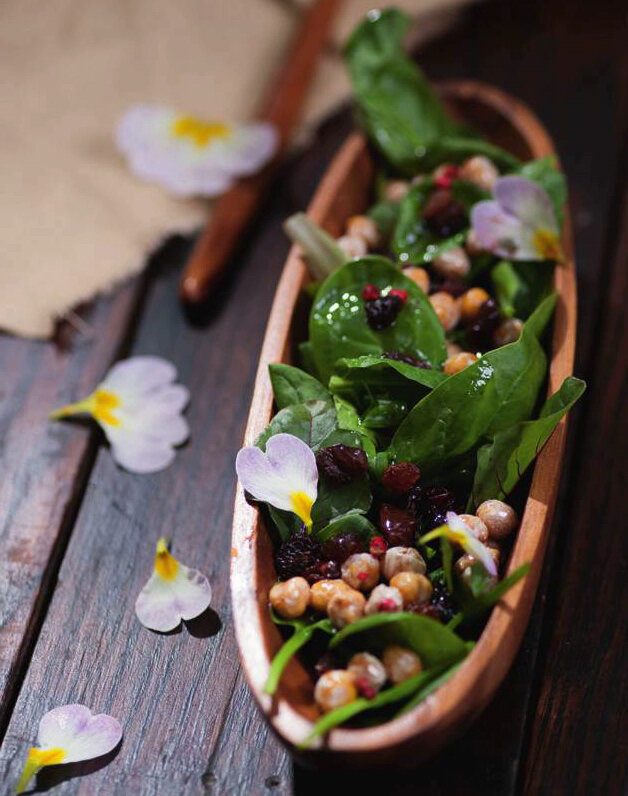 Интересно, что оригинальный рецепт этого салата описывается в поваренной книге XIV века «Способы приготовления еды». Сочетание молодого шпината, ботвы турнепса, тёмного изюма и обжаренного нута отлично подходит для лёгкого перекуса и угощения. По желанию Вы можете добавить укроп, петрушку или щавель, а чтобы сделать салат сладким можно положить в него чернику или клубнику, украсить зёрнышками граната. Ингредиенты: 5 стаканов молодого шпината, 3 стакана ботвы турнепса, 1 стакан тёмного или светлого изюма, 1 стакан обжаренного нута, растительное масло для обжаривания нута, оливковое масло, уксус, соль, зёрнышки граната (по желанию) Способ приготовления: Молодой шпинат, ботву турнепса вымойте и обсушите, измельчите. Изюм положите в чашу, залейте холодной водой, оставьте на 10 минут, а затем хорошо промойте. Нут сварите в кастрюльке до готовности, а затем обжарьте на растительном масле. В салатнике соедините измельчённый шпинат, ботву турнепса, изюм и обжаренный нут. Сверху полейте олив