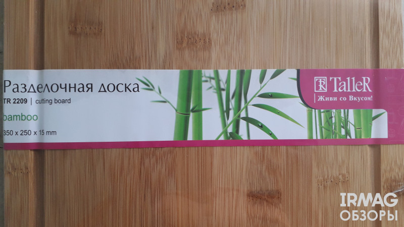 Обзор на разделочную доску Taller Всё-таки, во мне живёт эстет. Иногда он прорывается наружу и тут же начинает повсюду чинить свои порядки. Вот, например, решил он, что для овощей и зелени должна быть своя разделочная доска и точка, вынь да положи новую кухонную поверхность. И обязательно большую, чтоб ни в чём себя не ограничивать. В общем-то, сказано – сделано, вот она - новенькая и гладенькая, бамбуковая ждёт своего часа. Ждёт, надёжно упакованная в целлофан. И форма классическая – прямоугольная 35*25 см, толщина – 1,5 см. Этого достаточно, что б доска ощущалась под ножом, и при этом не была громоздким пьедесталом. Отверстие для подвешивания или транспортировки имеется. Как только сняла упаковку, первое, что почувствовала - запах дерева. Мой эстет ликует – натурально! На ощупь досточка гладенькая, при визуальной оценке без каких-либо изъянов. Древесный рисунок всегда приятен глазу, а по назначению можно использовать обе стороны.