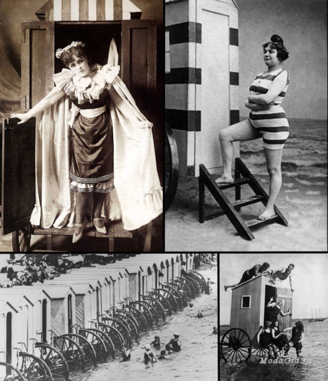 Со временем купальный костюм постепенно начал упрощаться и облегчаться – исчез корсет, короче стали платья, шляпку или чепчик заменил платочек. Но все же еще долгое время женские купальники создавались не для того, чтобы было удобно плавать и загорать (загар вообще считался дурным тоном), а чтобы, как писали журналы мод, «противостоять ветру, волнам и взглядам мужчин». До размеров, хоть как-то соотносимых с современными, женский купальный костюм сократился только в 1920-1930-х.