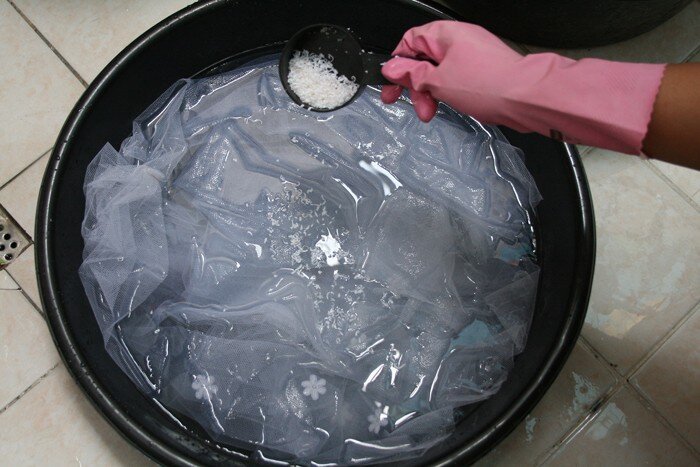 В воде разогретой до 36 градусов замачиваем ткань (тюль), добавляем много соли. Не удивляйтесь если вода потемнеет, это грязь пыль, оставляем на час - полтора.