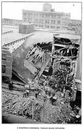 Вода с виду безобидное вещество. А бывает, что вода взрывается, словно порох. Да что порох! Вода раз в двадцать опаснее пороха, если не уметь с ней обращаться. Был случай, когда вода взорвала целый дом в пять этажей и убила двадцать три человека.Это было в Америке лет сорок тому назад. Как же это могло случиться? Дело в том, что в доме этом была фабрика. В нижнем этаже вмазан был в большую печку огромный котел. Воды в нем помещалось столько же, сколько в большом пруду. Когда печку топили, вода в котле кипела, а пар шел по трубе в паровую машину. Один раз машинист зазевался и не подкачал вовремя воды. В котле воды осталось совсем мало. А печка продолжала топиться. От этого стенки котла раскалились. Машинист об этом не подумал — взял да и пустил воду в раскаленный котел. А вы знаете, что бывает, когда льешь воду на раскаленное железо? Она вся сразу превращается в пар.То же самое случилось и тут. Вода вся превратилась в пар, пару в котле скопилось слишком много, котел не выдержал и лоп