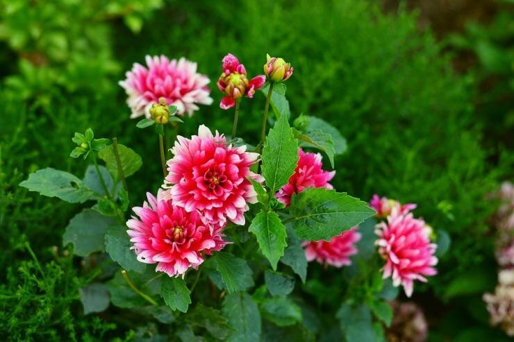Георгины однолетние низкорослые сорта «веселые ребята» вырастают высотой до 50 см и имеют соцветия до 10 см в диаметре с широким спектром расцветок. «Веселые ребята» это россыпь белых, красных, бардовых, желтых и розовых цветов с резными темно-зелеными листьями.