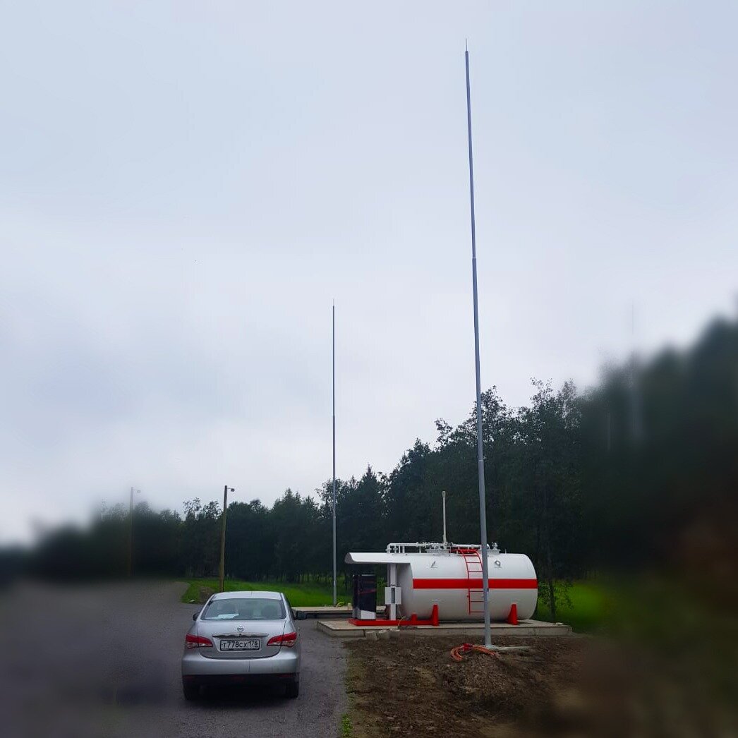 Представляете, что случится, если молния попадёт в цистерну с бензином? Точного ответа на этот вопрос лучше не знать. Так решили владельцы лодочной АЗС в Ленобласти и попросили нас установить для неё молниезащиту и заземление Ezetek. Изучив технические требования и свойства грунта, наш специалист понял, что монтировать нужно четыре очага заземления. В качестве заземлителей выбрали модульно-штыревые комплекты EZ-6 (арт. 90011) с омедненными стержнями диаметром 14 миллиметров (арт. 90121). Почва под АЗС и вокруг нее оказалась суглинистой, благоприятной для монтажа, - ситуация не потребовала трудоемких земляных работ. А вот для установки на закладные детали двух секционных молниеотводов (арт. 92127) пришлось заложить бетонный фундамент. К слову, каждый молниеотвод в высоту по 17,5 метров и весит почти 170 килограмм, так что площадка для таких алюминиевых великанов должна быть очень надежной. После подготовительного периода, на который ушло две недели, приступили к монтажу. При расчётах мы