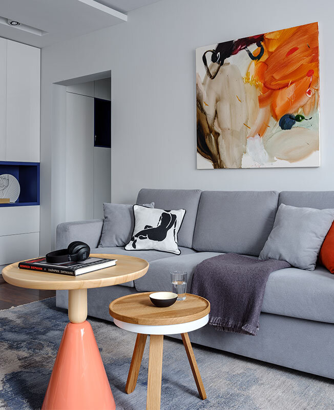 Дизайнеры Анастасия Туганова, Ярослав Ряжский, Юлия Гуревич (Studio25) оформили квартиру 83 кв. метра в Химках и рассказали о необычном опыте в их практике. Заказчики, пара с двумя детьми, принимали самое активное участие в реализации проекта за всю историю студии. «Владелец увидел в интернете один из наших проектов — интерьер в синих тонах, и обратился к нам за дизайном квартиры в новостройке. Заказчики хотели светлое, современное, функциональное пространство, а концепция строилась вокруг насыщенного синего цвета. С заказчиками мы очень быстро нашли общий язык. Можно сказать, что все решения принимались очень быстро — им нравились все идеи, которые мы предлагали. Положительный настрой владельцев вдохновлял нас ежедневно: в итоге мы сделали этот проект вдвое быстрее, чем обычно. Уложились в год с небольшим. Глобальную перепланировку не проводили, лишь поменяли местами назначение комнат — гостиную оборудовали на месте детской, и по-новому организовали пространство. Вся корпусная мебел