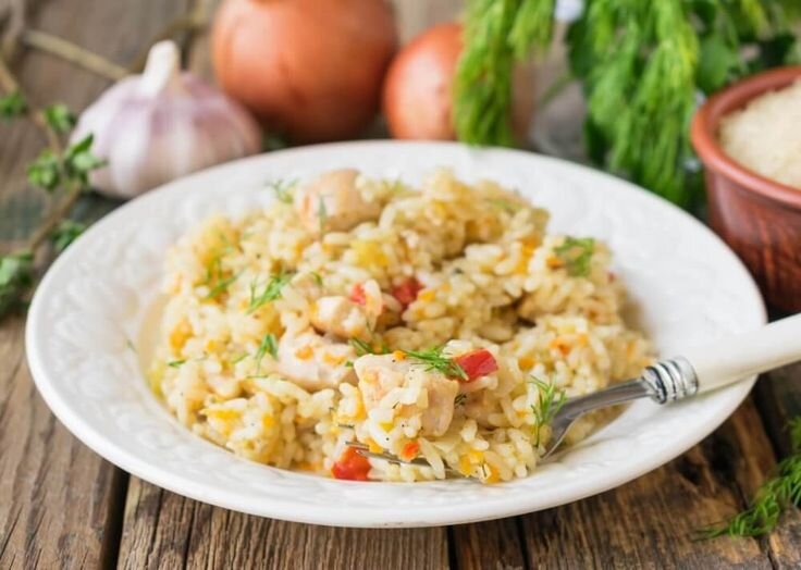 Сытный, вкусный ужин и бюджетный обед, который Вам точно понравится. Ингредиенты: 400 гр. риса 300 гр. куриного филе 800 мл воды репчатый лук 2 шт. моркови 1 шт. красного болгарского перца 1 стебель сельдерея 4 зубчика чеснока пучок зелени 4 ст. л. растительного масла 2 лавровых листа соль перец Приготовление: 1. Куриное филе нарезать кубиками, но не слишком мелкими или большими. 2. Обжарить курицу на растительном масле до румяной корочки. Готовую курочку выложить в глубокую форму для запекания. 3. Измельчить репчатый лук, болгарский перец и сельдерей кубиками. Морковь натереть на крупной терке. 4. Измельченные овощи потушить в сковороде на масле до мягкости. 5. Овощи переложить в форму к мясу, перемешать. 6. Рис промыть в проточной воде до прозрачной воды.