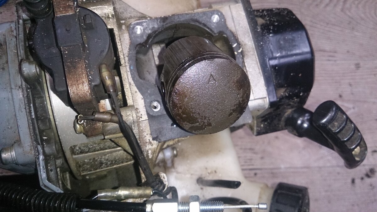 Попался мне триммер "Чемпион" Т 436 мой товарищ обратился с проблемой,связанной с неустойчивым холостым ходом,потерей мощности и трудным запуском я сразу же согласился. Данная модель имеет объем равный 42 куб., прямую штангу, и вес порядка 7 кг., достаточно мощная и не капризная модель. Этот производитель хорош тем, что для ремонта есть все необходимое, и запчасти в наличии всегда, но не тут то было.. При вскрытие оказалось, что поршневая не пригодна для ремонта, были случаи когда шлифовка цилиндра помогала убрать все задиры, но здесь они достаточно глубокие и смысла нет, так как проработала бы она не долго. В наличии такой поршневой не было, а сроки поджимали и было решено установить ЦПГ от 52 куб. триммера (1700011). Здесь понятно что сразу же возрастет нагрузка на подшипники, коленвал и опорный пальца. В этом случае все эти узлы идентичны для моделей производителя с 52 куб. объемом. Приступаем к снятию ЦПГ. По периметру крепиться 4- мя болтами под шести