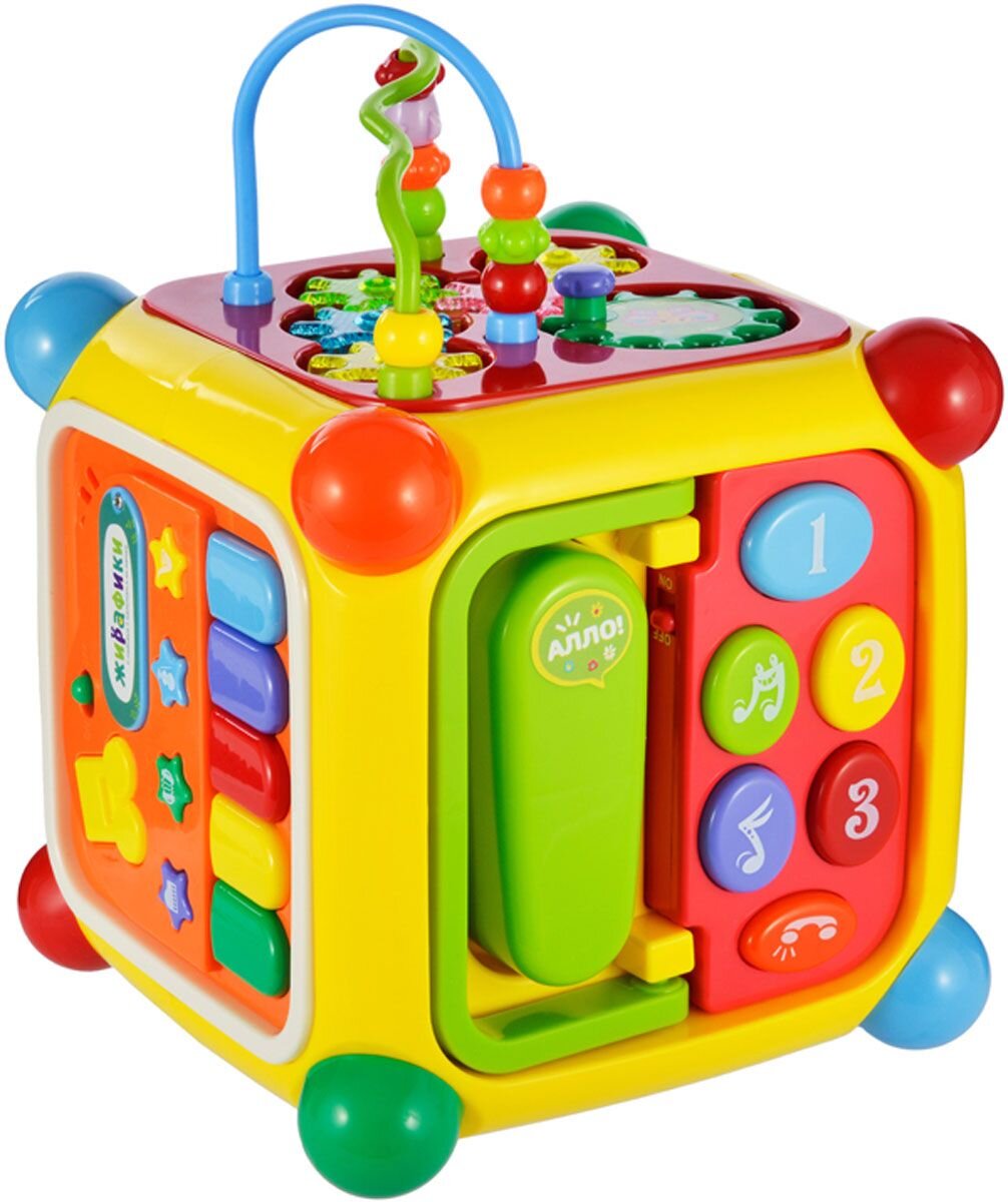 А игрушек на нем даже больше чем граней: и сортеры, и лабиринты, и телефон с кнопками, пианино, ключик с замочком, открывающиеся дверцы, разные крутилки и даже зеркальце. Все музыкальные игрушки имеют качественный "чистый" звук.