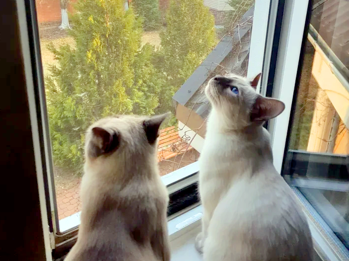 Я начала снимать видео не сразу, сорока достаточно долго заглядывала в окно, очень настойчиво и громко стучала клювом, чем привела в ступор нашего кота Степу, который даже не рванул к окну, как это делает, когда близко подлетает какая-нибудь птичка :)) Похоже, Степа был озадачен смелостью (или наглостью) сороки и, периодически посматривая на нас удивленным взглядом, глядел на этот птичий беспредел, даже не пытаясь "рваться в бой" :))) Когда сорока улетела, я проверила: миски с кормом действительно оказались пустыми, но я не могу быть убеждена, что именно это являлось причиной такой нас
