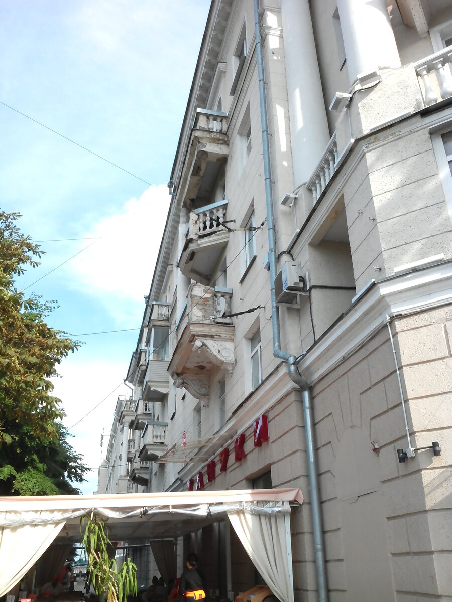 Данные колонны не являются несущими конструкциями , а придают дому определённое архитектурное значение . Сам 5 -ти этажный дом на улице Фридриха Энгельса построен в 1954 году . В данное время нет гарантии что , если не ещё одна колонна -так фрагмент штукатурки или кирпичной кладки которые находятся на самом балконе не посыпятся вниз . Под балконом находится защитная сетка , но она имеет крайне ограниченную площадь . И как мы видим сейчас - под ним мирно расположилась летняя площадка кафе , хотя всю весну данная территория была огорожена от прохожих сигнальной лентой и досками . То есть сейчас уже стало безопасно ? В соответствии с региональной программой капитального ремонта общего имущества в многоквартирных домах Воронежской области на 2014-2044 годы капремонт фасада дома №