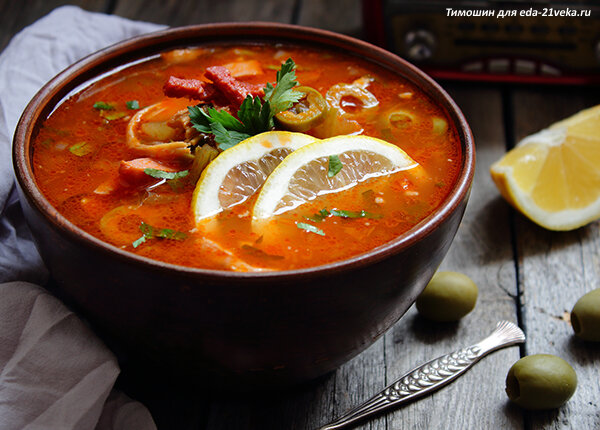 Жидкие солянки на Руси всегда готовят на крепких рыбных, грибных, (в нашем случае) мясных бульонах. Это значит, что залог этого вкусного супа, есть не что иное, как правильно сваренный концентрированный мясной бульон. Сварить его не сложно, но времени отнимает много. Поэтому бульон, я готовлю заранее и храню в холодильнике, чтобы не тратить на процесс его приготовления много времени. Повара, готовящие солянку, в её рецептуре, в основном, используют от трёх до шести наименований мясных продуктов, это: говядина, телятина, курятина, языки, почки, ветчина, сосиски, различные виды колбас и т.д. А ещё лучше, если в состав солянки обязательно будут входить нежирная ветчина и сосиски. Вариантом же моего рецепта будет сборная жидкая солянка из набора мясных продуктов, приведенных ниже, в разделе ингредиенты. ...Так как же правильно сварить русскую жидкую солянку? ...Читаем ниже и готовим вместе! Ингредиенты на 4 порции: Для бульона: Способ приготовления смотрите на eda-21veka.ru
