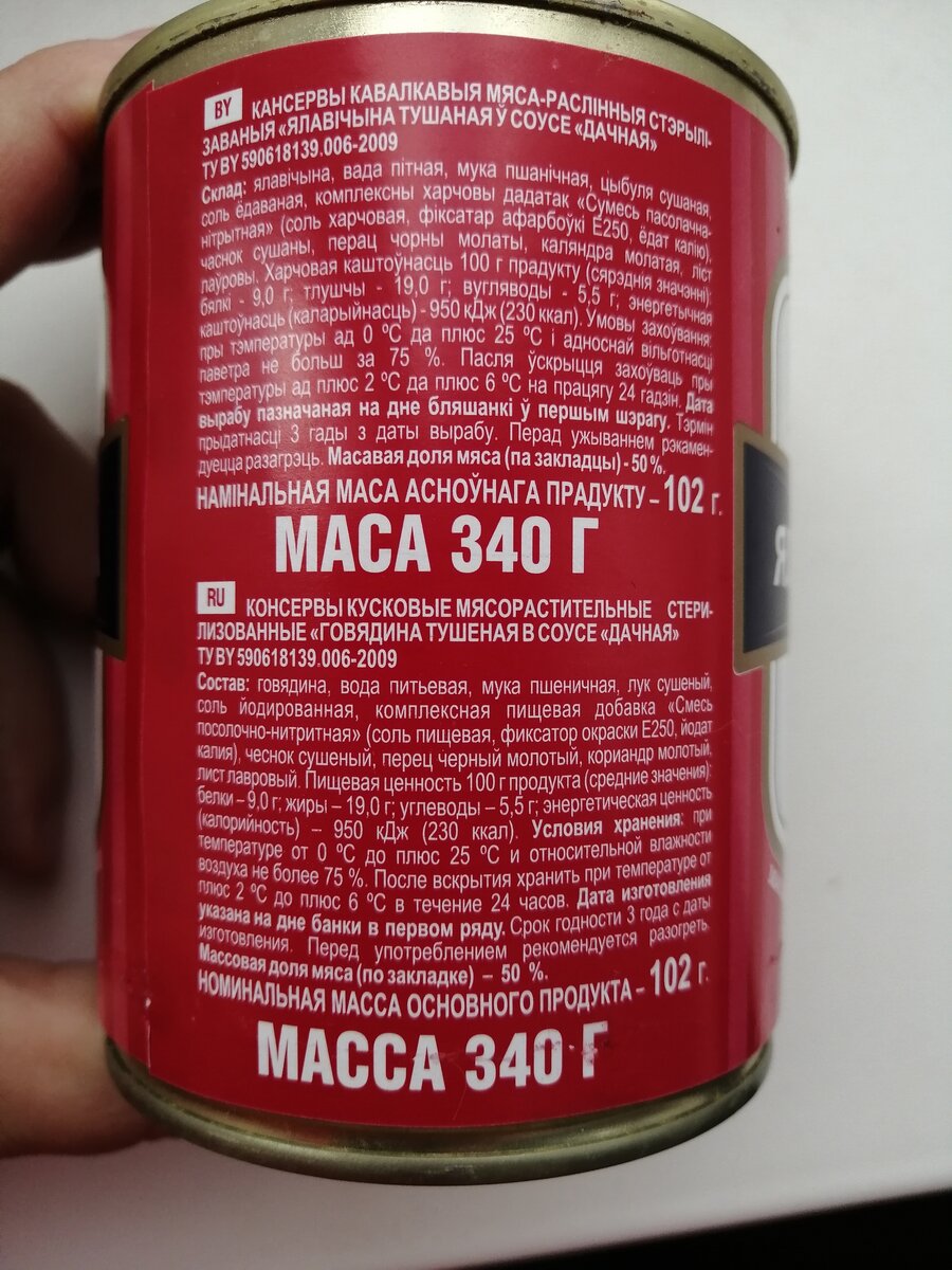 Сейчас будет "трэш-контент". Просьба убрать женщин, детей и любителей тушенки от экрана. Вот вы догадывались, что Беларусь может создать плохую тушенку? Вот и я нет. Пока не наткнулась на это чудо. Знакомьтесь, консервы Говядина тушеная в соусе "дачная". Производитель: ООО "Квинфуд" город Гродно. Стоимость 3.19 бел. рубля или 99 российских рублей. Состав: говядина, вода, мука, лук сушеный, соль, пищевая добавка "Смесь полосочно-нитритная" (соль, фиксатор окраски Е250, йодат калия), чеснок, перец, кориандр, лист лавровый. Вроде и ничего страшного, но вода и мука на втором и третьем месте заставляет задуматься. Видимо это и есть дачный соус. Но если верить составу, там есть и говядина. Целых 50%. Попытаемся ее найти: Выглядит странно уже при вскрытии. Пахнет как смесь тушенки и кошачьего корма.