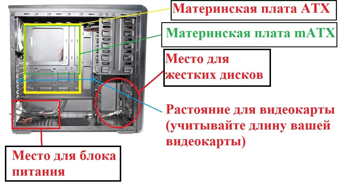 У многих возникают вопрос, как мне подобрать корпус для моего «железного» товарища? В большинстве случаев говорят: «бери, который понравится», но не всегда это правильно. У каждого корпуса: 1) свои габариты 2) отверстия для охлаждения 3) свое место для расположения комплектующих (например: блок питания может быть сверху или снизу корпуса) По-простому: есть полноценные материнские платы с 4 слотами для оперативной памяти - ATX, а есть урезанные с 2 слотами - mATX. Цена у них отличается на 50-100% в среднем. Так же они отличаются и размерами. Если компьютер игровой, смотрим длину видеокарты и уже отталкиваемся от этих данных. Для игрового компьютера рекомендуется брать ATX размер материнской платы и большой корпус, что бы было место для вентиляции. Если планируем часто играть - лучше поставить дополнительные вентиляторы на обдув оперативной памяти или сразу покупать их с радиаторами. Так же обеспечить внутри корпуса проточный воздух. Это делается с помощью вентилятора спереди корпус