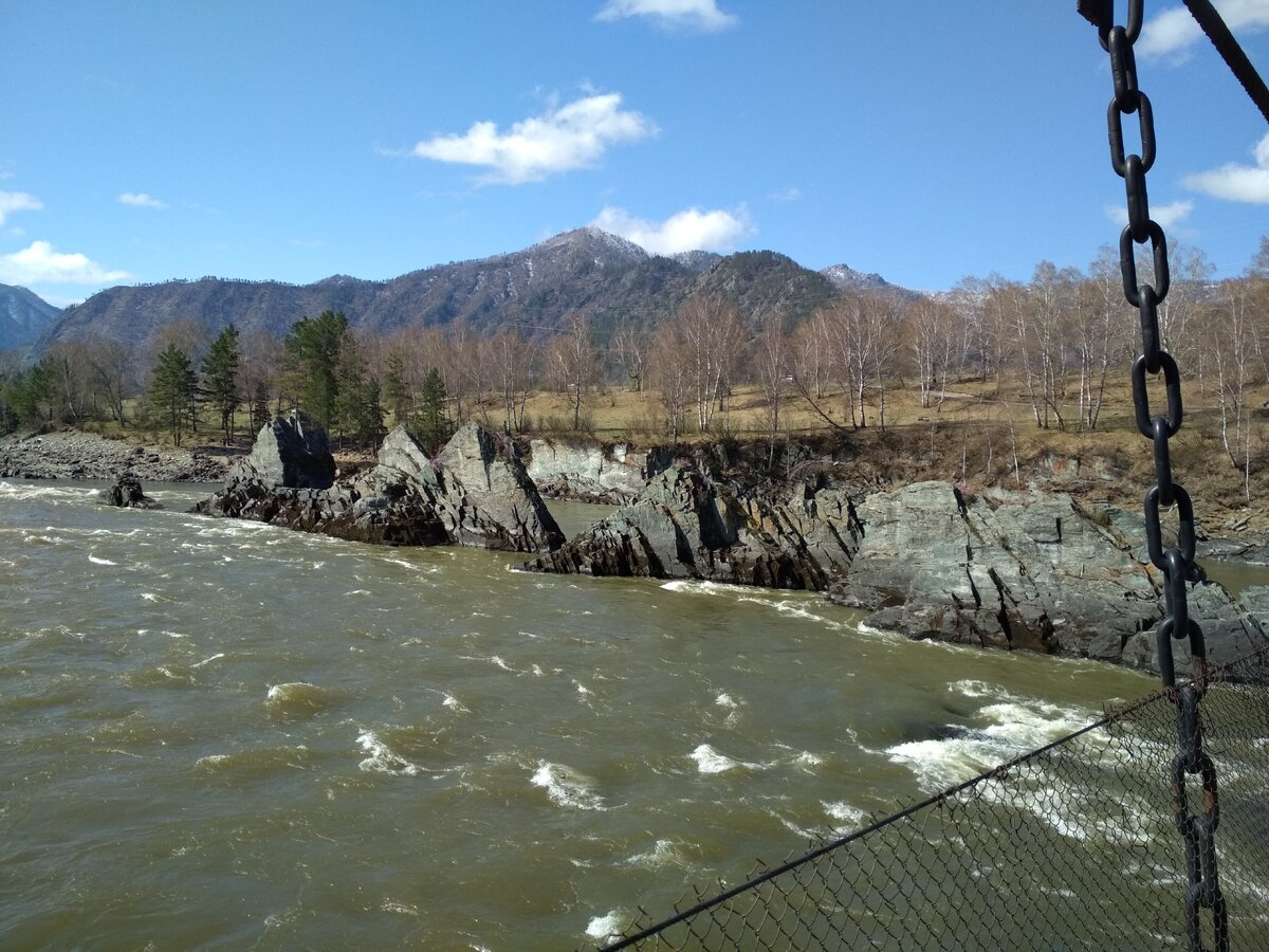 В районе села Элекмонар есть мост через Катунь. На другом берегу кстати Чемальская Рублевка, я писала об этом в своем блоге. А с моста, да и с обоих берегов хорошо видны Зубы дракона - ряд треугольных скал, стоящих посреди реки. Когда пойдете по мосту, просто представьте себе, что в 2014 году его сносило паводком - такой была высокой и бурной вода.
