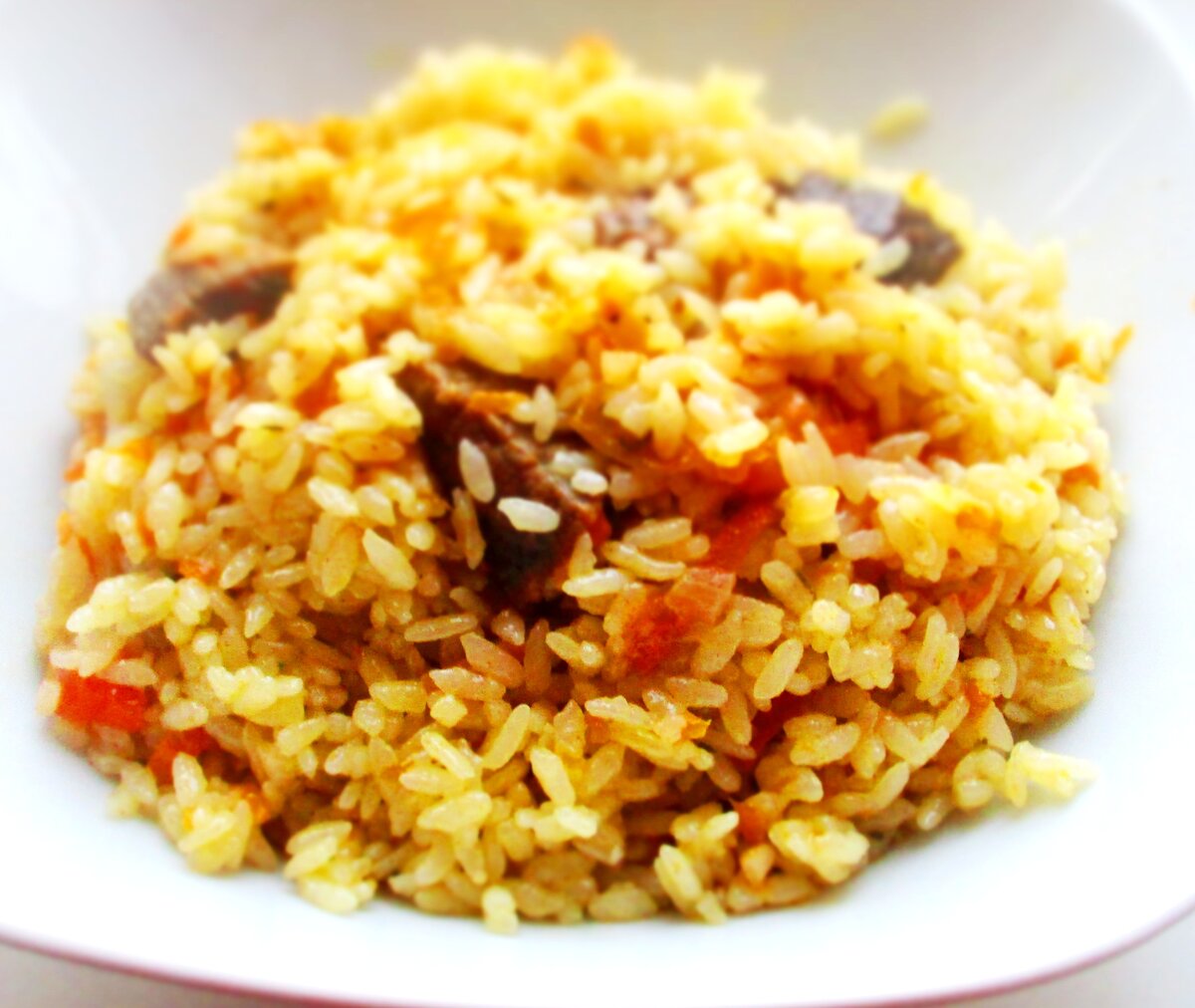 Засыпать рис в казан, воды добавить меньше, чем на одну фалангу мизинца. Не перемешивать содержимое!