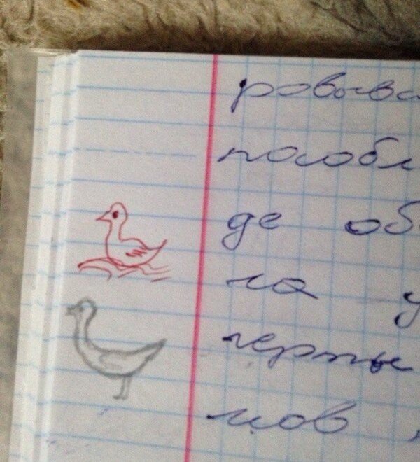 То, что ученики любят рисовать в тетрадях, мы знаем, а вот учителя оставляют свои "композиции" редко. Но от этого только интереснее на них смотреть! Например, вот этот ученик от безделья или от большой любви к уткам нарисовал маленькую плывущую птицу на полях. Получилось не ахти, и добрый учитель решил подправить творение: Но чаще учителя рисуют в тетрадях, чтобы наглядно показать какой-то учебный материал. Вы путаете понятия "эволюция" и "революция"? Соглашусь, они похожи по звучанию, но после этой супер-наглядной схемы вы точно научитесь различать их: Это была биология. По истории тоже хватает путаницы. Слова "кочевники" и "католики" вам знакомы? А один ученик их спутал. Но рядом оказался учитель с юмором и помог нерадивому школьнику: Если они забудут эти понятия, то тетрадка с рисунками их учителей будет под рукой и напомнит об этом забавном случае спутанных слов. Подписывайтесь и ставьте лайк!