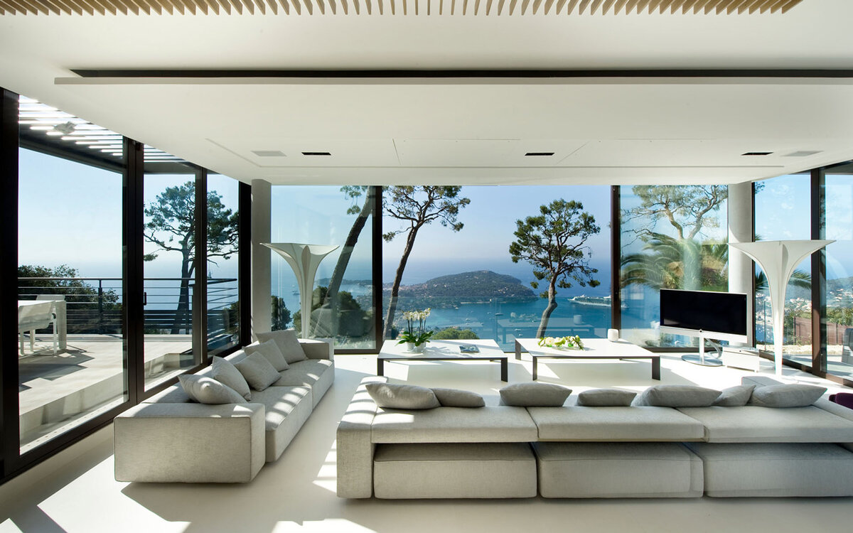 Парадный фасад дома, выходящий на улицу, почти всегда спроектирован приватным и почти не содержит окон, тогда как задний фасад дома, выходящий в сторону террасы и сада, почти полностью стеклянный.