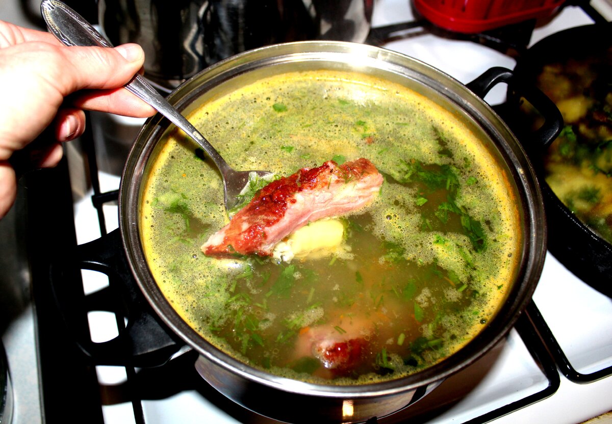 Думаю, прочитав рецепт до конца, Вы поймёте, из-за чего супчик называю "музыкальным". Ниже, в комментариях, с удовольствием прочту ваши варианты названий. Хочу заметить, что получается суп всегда вкусным и очень ароматным! Пока готовлю его, запах копчёностей, будоражащий аппетит, разносится по всему подъезду! А ещё этот суп можно назвать супом с двойным мясом. Почему - найдёте в конце статьи! Ну, что?! Слюнки уже потекли?! Тогда приступаем к приготовлению. Для начала нам понадобятся копчёные рёбрышки. Обычно я покупаю их в вакуумной упаковке. Выбираю те, на которых побольше мяса - бульон получиnся наваристее! Извлекаю из термоусадочного пакета. Разрезаю на небольшие порционные кусочки, чтобы в дальнейшем мясо было удобно кушать. На огонь помещаю кастрюлю с водой. Пока она закипает - замачиваю сушёный горох. Лучше брать колотый шлифованный или пропаренный. Шинкую репчатый лук, натираю морковь. В кипящую воду выкладываю предварительно замоченный горох и подготовленные овощи. Варю на мед
