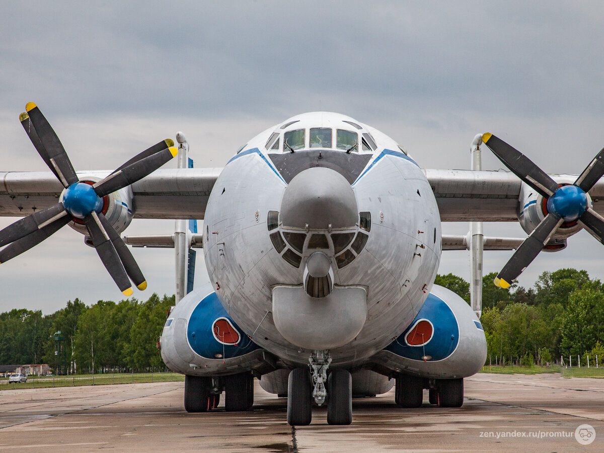 Этот самолёт настолько большой, что даже не вериться в то, что он может летать. Мне удалось побывать внутри этого монстра и в деталях рассмотреть кабину пилотов. На сегодняшний день, это самый большой в мире турбовинтовой самолёт. Его длина: 57,31 м. Размах крыла: 64,40 м Высота: 12,53 м. Масса пустого: 118 727 кг. Его проектировали в 1965 году для перевозки на большие расстояния крупных и тяжёлых грузов, вооружения, военной техники и войск. Проектировали самолёт с огромным заделом по прочности и мощности. Для примера, мощность каждого из четырёх двигателей 15265 лошадиных сил! А настил пола грузовой кабины выполнен из титанового сплава. Заходим внутрь. Когда ты внутри, поверить в то, что это самолёт трудно. Грузовой отсек огромный. Всего АН-22 может поднять и перевести 60 тонн грузов, или 290 солдат, или 150 парашютистов-десантников Аварийный выход. Диаметр фюзеляжа — 6 метров. Фюзеляж самолёта из четырёх отъёмных частей. 1. Носовой отсек. Там находится кабина экипажа. О