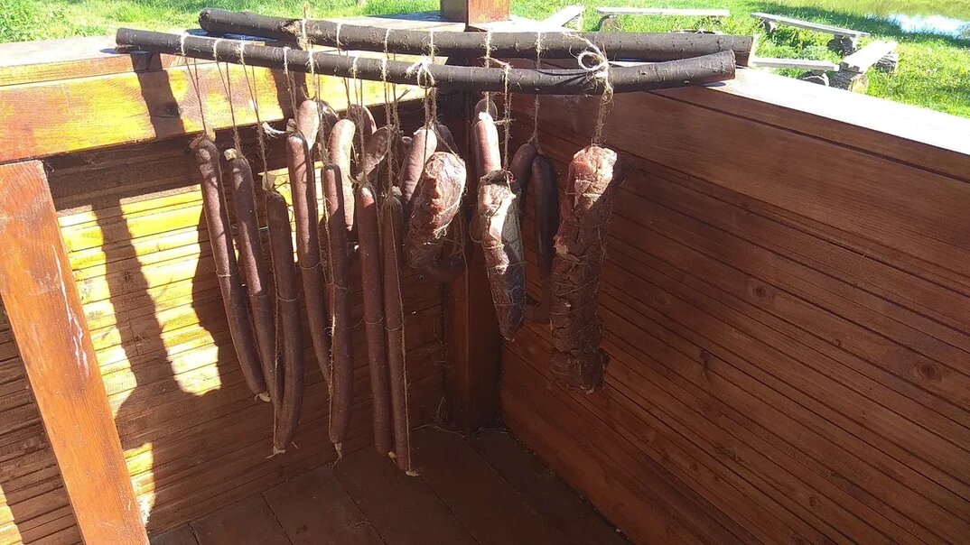 Это – из мяса. Сырокопченая телячья колбаса. Делаем сами.