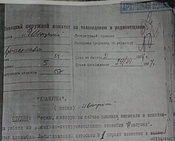 Сценарий радиопередачи "Иванушка" ("Радио Ямала", эфир 29 июня 1974 г.)