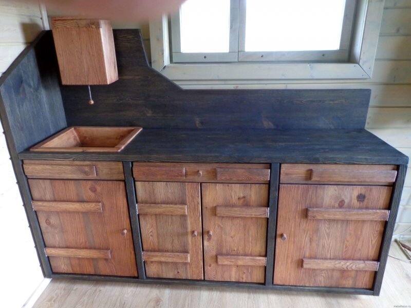 Основным критерием для этой кухни является функциональность, повышенная прочность и простота, как и весь деревенский уклад жизни. Изготавливалась без чертежа и эскиза – “как пила ляжет”. Гостевой домик небольшой. Хозяйственной утвари мало, только самое необходимое, поэтому всё вмещается в два отделения стола (одно с двумя дверками и второе с одной). Отделение под мойкой предусмотрено для слива использованной воды в ведро, по-старинке, или в отводную трубу (кому как). Так-же под раковиной устроены небольшие полочки для моющих средств. Остальные отделения стандартны, под посуду. Посередине устроен большой выдвижной ящик разделёнными на три секции для столовых приборов и мелочей. Изюминкой этой кухни является врезная раковина и рукомойник, выполненные из дерева. История принятия решения сделать их из массива такова: гостевой домик находится далеко в лесу и что-бы купить готовую раковину и рукомойник нужно потратить целый день на поездку в город в магазин и деньги. Вместо этого пол дня в