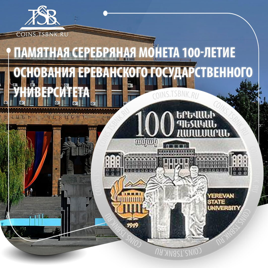 Центральный банк Армении в 2019 году выпустил в обращение серебряную памятную монету номиналом 1000 драмов, посвященную 100-летию образования Ереванского Государственного Университета. Монету отчеканили на литовском монетном дворе. ✍️ Ереванский государственный университет был основан 16 мая 1919 года. Самую первую лекцию в университете прочитал выдающийся арменовед Степан Малхасянц. В Ереванском государственном университете преподавали такие выдающиеся армянские ученые как Я. Манандян, М. Абегян, Г. Ачарян, Лео, Г. Капанцян и другие. На сегодняшний день Ереванский государственный университет Остаётся одним из самых привлекательных высших учебных заведений в котором обучаются 1000 студентов получая современные специальности. В университете ведутся научно-исследовательские работы в самых различных областях современной науки. ➡️ Характеристика монеты “100-летие образования Ереванского Государственного Университета”: ✔️ Металл / проба – серебро / 925° ✔️Масса монеты, (грамм) – 33.6 ✔️Д
