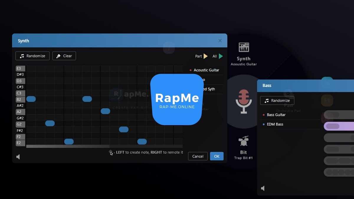 RapMe (https://rap-me.online) - простой онлайн-секвенсор для написания музыки в стиле новой школы, с помощью которого можно создавать биты, записывать и обрабатывать вокал. В RapMe можно создавать минуса для каверов известных песен или делать уникальные авторские треки. Подходит начинающим музыкантам для записи демо-композиций и оттачивания мастерства Flow. Сервис можно использовать в студиях звукозаписи, а так же на live-выступлениях в качестве микшера.