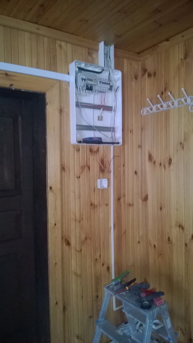 Электрик должен был мне сделать ввод от столба в дом, заземление (вогнали 3 здоровенных, больше 3-х метров железных штыря в землю), убрать старый счетчик, поставить щиток.