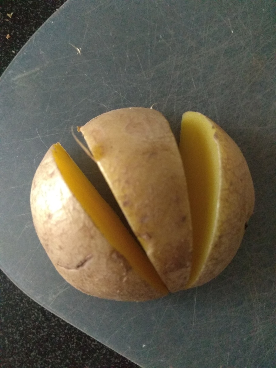 Почти готовый картофель нарезаем вдоль пополам, а затем каждую половинку на три части веером, вот так: