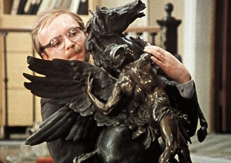 В последних двух фильмах он не часть интерьера, он ( Персей) настоящий артист. Его куда то тащат все время, его прячут за сценой ( что бы юбиляр раньше времени не обрадовался). По сути, он сводит на некоторое время главных героев вместе ,наедине, в том самом зале.