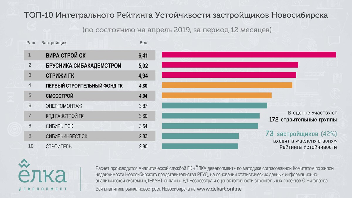 Всего в актуальном Рейтинге устойчивости участвуют 172-е строительные группы. В так называемую «зеленую зону», то есть в перечень застройщиков с минимальными рисками, попали только 73 застройщика, или всего 42% от всех строительных групп, которые возводят жилые комплексы в Новосибирской агломерации.