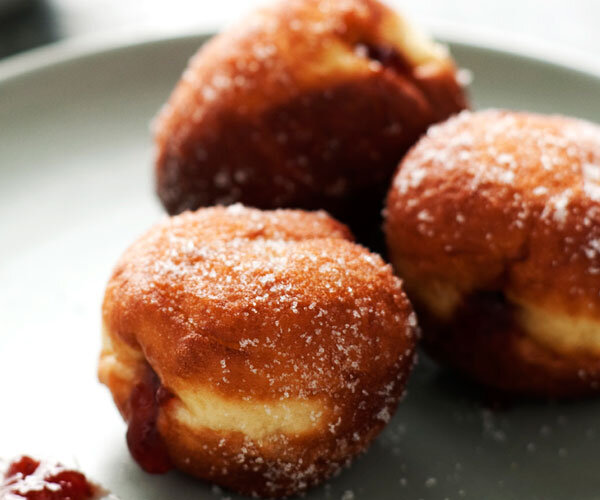 Этот рецепт использует более скудное, менее сладкое тесто, чем ваш типичный американский пончик с желе. Для достижения наилучших результатов используйте домашние консервы или местное варенье самого высокого качества, которое только можно найти. Если ваше варенье очень толстое, протрите его в блендере или небольшом кухонном комбайне, чтобы оно без труда прошло через кончик пакета для теста и в пончик. Ингредиенты 500г (4 чашки) небеленая мука общего назначения 1–3 стакана сахара, плюс еще для покрытия пончиков 1 ст. плюс 1-1⁄2 ч. л. дрожжи быстрого приготовления 3х4 ч. Л. мелкая морская соль или кошерная соль 1 стакан молока комнатной температуры (от 20 С до 25 С) 70 г (5 ст. Л.) Несоленого масла, размягченного 2 больших яйца 2 больших яичных желтка 1 ч. Л. тертая цедра лимона 2 ч. Л. чистый ванильный экстракт Масло растительное, для жарки 6 ст. малинового варенья Способ приготовления Смешайте муку, сахар, дрожжи, соль, молоко, сливочное масло, яйца, яичные желтки, цедру лимона и вани