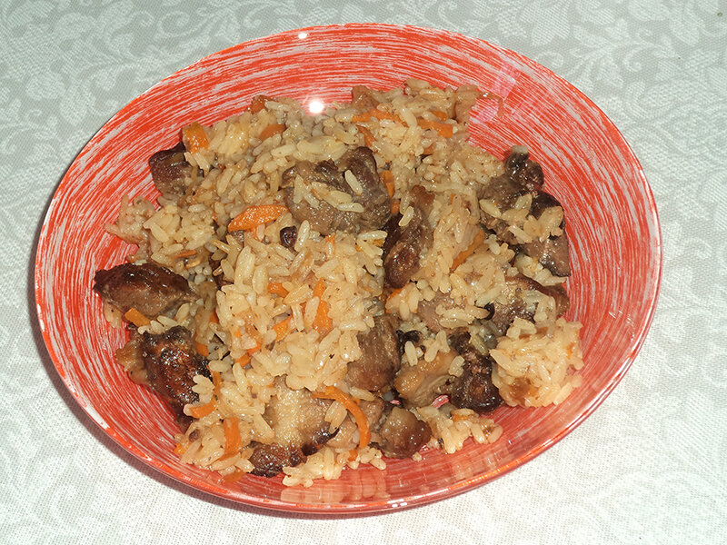 5. Пришло время риса. Его, кстати, следует не только хорошо промыть, но и залить холодной водой на 20-30 минут (как раз, пока тушится мясо). Затем закладываем рис в мультиварку.