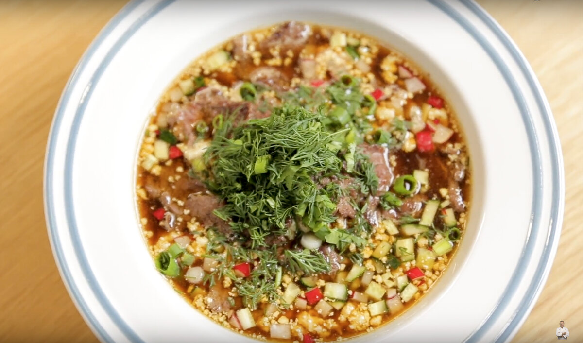Окрошка – очень популярное блюдо русской кухни. Рецептов её много, но традиционная русская окрошка - на квасе. Её мы и будем делать, и приготовление не займет у нас много времени. Ингредиенты: Говядина Картофель Квас Красный винный уксус Яйца Редис Малосольный огурец Лук зеленый Укроп Кинза Растительное масло Соевый соус Острая горчица Черный перец Соль Приготовление: Отвариваем картофель. Делаем картофельное пюре с ложкой растительного масла. Добавляем черный перец. Говядину нарезаем тонкими пластинками и обжариваем на разогретой сковороде. Солим, перчим. Тонко нарезанное мясо обжаривается очень быстро. Отваренные вкрутую яйца разминаем вилкой, добавляем к ним мелко нарезанный редис и малосольный огурец. Зеленый лук, укроп и кинзу мелко нарезаем. Заправка для окрошки: пол-литра кваса, две столовые ложки красного винного уксуса, одна столовая ложка соевого соуса и острая горчица. Всё это солим. В тарелку выкладываем картофельное пюре, размятые яйца с овощами, говядину и заливаем всё за