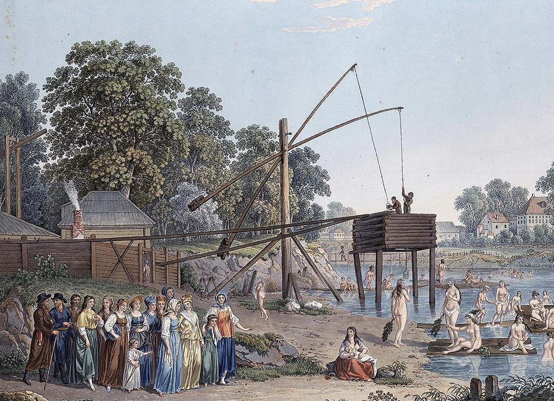 В VII веке на Руси общественные бани строились преимущественно у водоемов, чтобы было проще забирать воду из реки с помощью так называемых «журавлей». Из реки вода шла по деревянному желобу, пропущенному через отверстия в стене и попадала в чаны, установленные внутри парилки. На плане австрийского посла Мейерберга (1695) подобные установки для подъема воды были отмечены на Яузе и Москва-реке. Как оказалось, работу по забору воды выполняли не банщики, а специальные люди – водоливы. В пользу этой версии говорит документ 1633 года о польских лазутчиках, в котором упоминаются банщик торговой бани Никифорко и водолив Тараско Белозеров. Художник Де ла Барт, проживавший в Москве с 1785 по 1810 гг., запечатлел «журавлей» на правом берегу Яузы. В этот период времени уже существовало разделение на женскую и мужскую баню. На гравюре как раз женское отделение принимает речные ванны рядом с баней на Серебрянической набережной. Оригинал статьи находится здесь: https://goosi-lebedi.ru