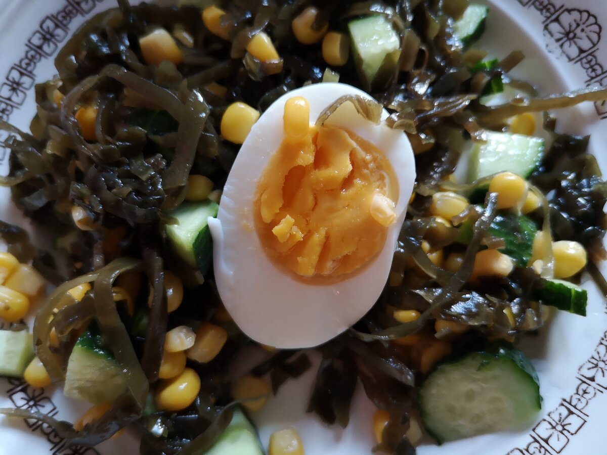 Не люблю я морскую капусту. Единственный салат из морской капусты, который реально вкусно делают, продается в торговом центре у метро Семеновская- с чесночком, кунжутом. Покупаю, лишь когда бываю в тех краях проездом. Остальные салаты из морской капусты как-то делают не так- то сладкий, то приправ не хватает, то лук с морковью в салате не сочетаются. Я много видов готовых салатов из нее покупала, но ни один не нравится. Зато морскую капусту любит муж, поэтому за компанию иногда приходится ее употреблять. Как-то в столовой в одной нашла интересную подачу салата из морской капусты- добавили консервированный горошек и варенное яйцо с майонезом. И знаете, мне понравилось! С тех пор, если в доме заводится баночка морской капусты невкусной, то я добавляю необходимые ингредиенты и салат тогда идет "на ура!" Ну не выкидывать же неудачный салат, раз купили, с нормальными сроками? С горошком, майонезом и яйцом получается вкусное сочетание. Недавно попробовала сделать с кукурузой, горошка не б