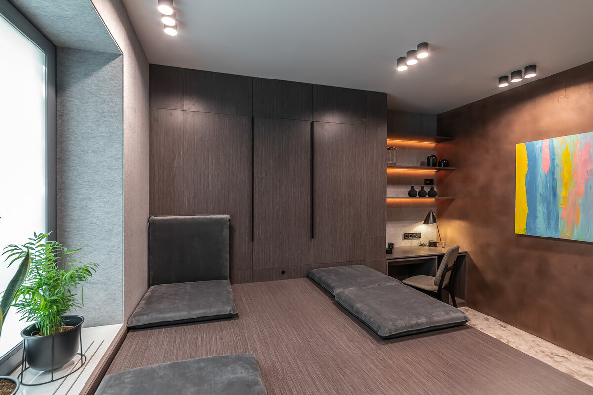 В интерьере новой спальни "Квартирный вопрос" построил 3D-кубик. В нем прячется все: и кровать, и диван, и гардеробная, и даже небольшой кинотеатр! ДО ПЕРЕДЕЛКИ Когда Елена и Андрей делали ремонт в своей квартире, то в первую очередь они подумали о детях и привели в порядок их комнаты. А свою спальню оставили напоследок. Старые обои в ней не везде уцелели, интернет-кабель протянут прямо над головой, декор стен тоже своеобразный – из бейсболок хозяина квартиры. Пора навести порядок и здесь! ОЖИДАНИЯ ГЕРОЕВ Хочется, чтобы в комнате стало светлее и тише. Функционально нужно сохранить большое и комфортное спальное место, кабинет, где можно поработать, шкаф для хранения вещей и сохранить свободное пространство для занятий спортом. А в отделке хочется необычных решений: много зелени, отсылающей к джунглям, или увидеть предметы декора, которые будут напоминать о дальних странах и путешествиях. АВТОРСКАЯ КОНЦЕПЦИЯ С самого начала знакомства мы поняли, что наши герои – очень р