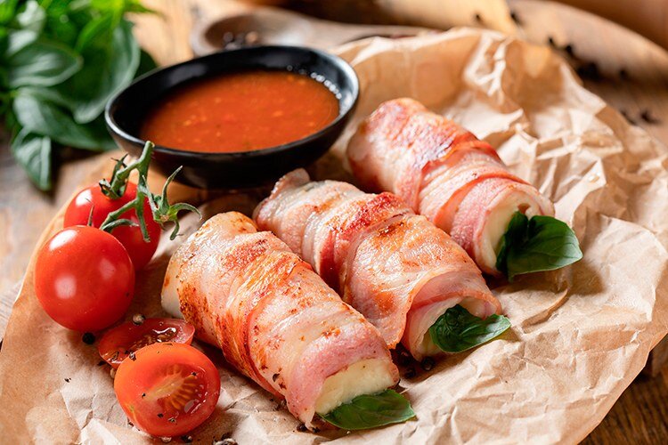 Ингредиенты: Сулугуни - 120 гр Бекон в нарезке - 120 гр Базилик зеленый (листья) - 3 гр Помидоры черри - 60 гр Соус сацебели - 40 гр Способ приготовления: 1. Сулугуни нарезать брусочками длиной 8 см, шириной и толщиной 2 см. На каждый брусок (с одной стороны) с краю положить один листик базилика так, чтобы половина листика выходила за край. 2. Брусочки с листиками завернуть в бекон, по паре кусочков на каждый брусок. Пластины бекона должны быть внахлест. 3. Сковороду застелить пергаментом, обжарить рулетики до золотистого цвета бекона. Готовые рулетики выложить на тарелку, украсить помидорами черри, подавать с соусом сацебели. Приятного аппетита!