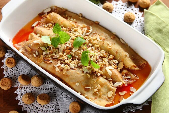 Шаг 1 1/3 клубники, засыпайте сахар, а затем взбить с помощью блендера. Остальную клубнику нарезать на четвертинки и перемешайте с образовавшимся соусом. Мяту нарезать тонкими полоски и добавить в фрукты. Шаг 2 Вылейте яйца в миску, затем добавьте оставшиеся ингредиенты - муку, молоко, воду, масло и мед и перемешайте до получения теста с однородной консистенцией. Шаг 3 Приготовьте блины с обеих сторон до золотистого цвета. Шаг 4 Положите фрукты на жареные блины и сверните их. Нагрейте противень со смазанным маргарином и положите в него блины. Затем добавьте кленовый сироп и посыпьте грецкими орехами. Поместите все в разогретую духовку и запекайте в течение 8 минут при температуре 175 градусов. Украсьте листьями мяты или лимонным бальзамом.
