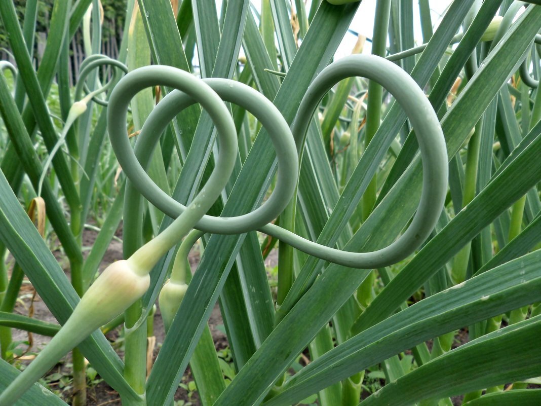 Июнь- это месяц, когда все весенние посадочные работы закончены и остается только «контролировать» созревание будущего урожая. Даже такой неприхотливой культуре, как чеснок контроль нужен. Наряду с поливом ему нужно вовремя проводить выламывание стрелок. Cтрелки дает только озимый чеснок, поэтому, если Вы разводите яровой, то этой процедуры у Вас может не быть. Цветущий чеснок имеет очень красивый вид и не уступает даже клумбовым культурам, но вот на урожай это влияет не лучшим образом, т.к. питательные вещества вместо наращивания луковицы идет на цветение. Разницу в урожайности, естественно, точно не предсказать, но агрономы называют цифру около 30%. Саму процедуры удаления стрелок проводят примерно в начале- середине июня, когда стрелки еще «колечком» и не успели зацвести. В это время цветонос еще очень мягкий и его можно выщипывать прямо рукой. Хорошим завершением этой операции для чеснока будет очередная подкормка. В основном в это время выполняю мульчирование перегноем, чт