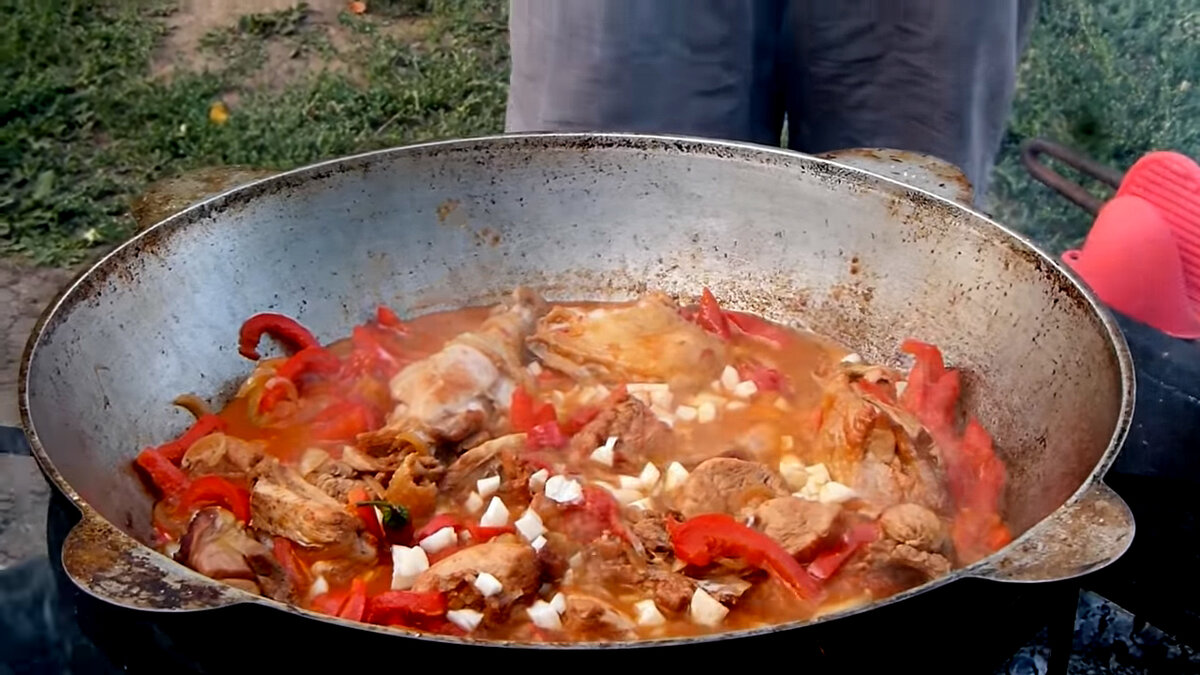 Чахохбили-национальное грузинское блюдо,простыми словами рагу из птицы.Расскажу Вам как готовлю этот грузинский шедевр кулинария я,а готовить будем в казане. Для приготовления данного блюда нам понадобится: -------------------------------------------------------------------------- сливочное масло куски курицы помидоры соль черный перец красный болгарский перец чеснок острый перец Сначала хорошо прогреваем казан,берем большой кусок сливочного масла и смазываем весь казан изнутри,чтобы масло полностью растопилось. В растопленном масле обжариваем куски курицы,помешиваем,чтобы мясо не пригорело. Когда мясо обжарено до золотистой корочки,то добавляем к нему нарезанный лук(чем больше- тем лучше) и мешаем.Лук отдаст сок,перемешается с маслом и получится луковый соус.Обжариваем постоянно помешивая лук с мясом примерно 10 минут. Очищаем от кожуры помидоры и целиком кидаем в казан(можно их порезать).По вкусу солим и перчим. Добавляем нарезанный соломкой сладкий перец,накрываем казан крышкой и