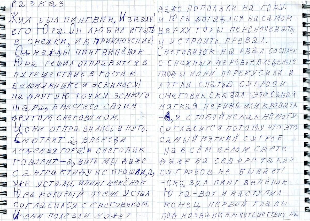 Глава первая: Жил-был пингвин. И звали его Юра. Он любил играть в снежки и в приключения! Однажды пингвинёнок Юра решил отправиться в путешествие в гости к белому мишке и эскимосу на другую точку земного шара, вместе со своим другом снеговиком. И они отправились в путь. Смотрят, а впереди ледяная гора! И снеговик говорит — а, ведь, мы даже Антарктиду не прошли, а уже устали. И пингвинёнок Юра, который очень устал, согласился со снеговиком. И они полезли, может, даже, поползли на гору. И Юра догадался на самом верху горы переночевать и устроить привал. Снеговик нарвал сосулек со снежных деревьев — ледяные плоды, и они перекусили и легли спать в сугроб. И снеговик сказал — это самая мягкая перина или кровать. — А я с тобой никак не могу согласиться, потому, что это самый мягкий сугроб на всём белом свете, даже на севере таких сугробов не бывает! — сказал пингвинёнок Юра. Вот и наступил конец первой главы под названием «Путешествие на гору» или «Что едят снеговики?» Глава вторая ->