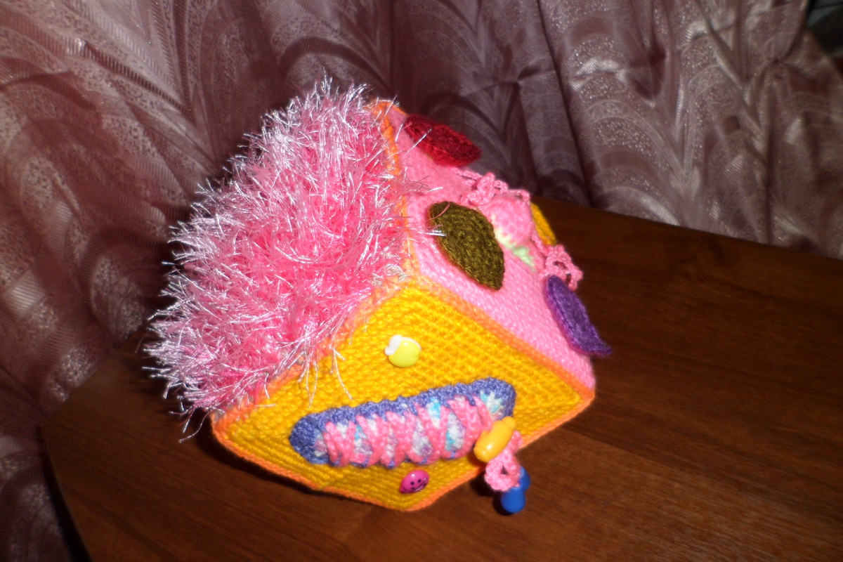 По дому всегда есть множество дел... А с рождением малыша их становится только больше. Маленький человечек требует пристального внимания к себе, и кажется, что выделить некоторое время из череды забот, просто невозможно! А ведь готовку, уборку и прочие домашние хлопоты никто не отменял)) Рано или поздно возникает вопрос, чем же занять малыша? Конечно, можно каждый день покупать новую игрушку. Несомненно, это будет завлекать малыша на какое-то время) Но для творческих мам есть более приятный способ. Развивающий кубик - отличное решение проблемы) Во-первых, есть где проявить фантазию и отвлечься, занимаясь любимым делом. Во-вторых, такую игрушку можно связать из разных остаточков, а это, по большому счету - порядок в доме;) В-третьих, игрушка для малыша, сделанная любящими руками мамы, несёт самую теплую энергетику и наверняка станет самой любимой)) Вот такой кубик получился у меня Сторона 1 - "геометрические фигурки" - малыш учится узнавать основные фигуры Сторона 2 - "шнуровка" -
