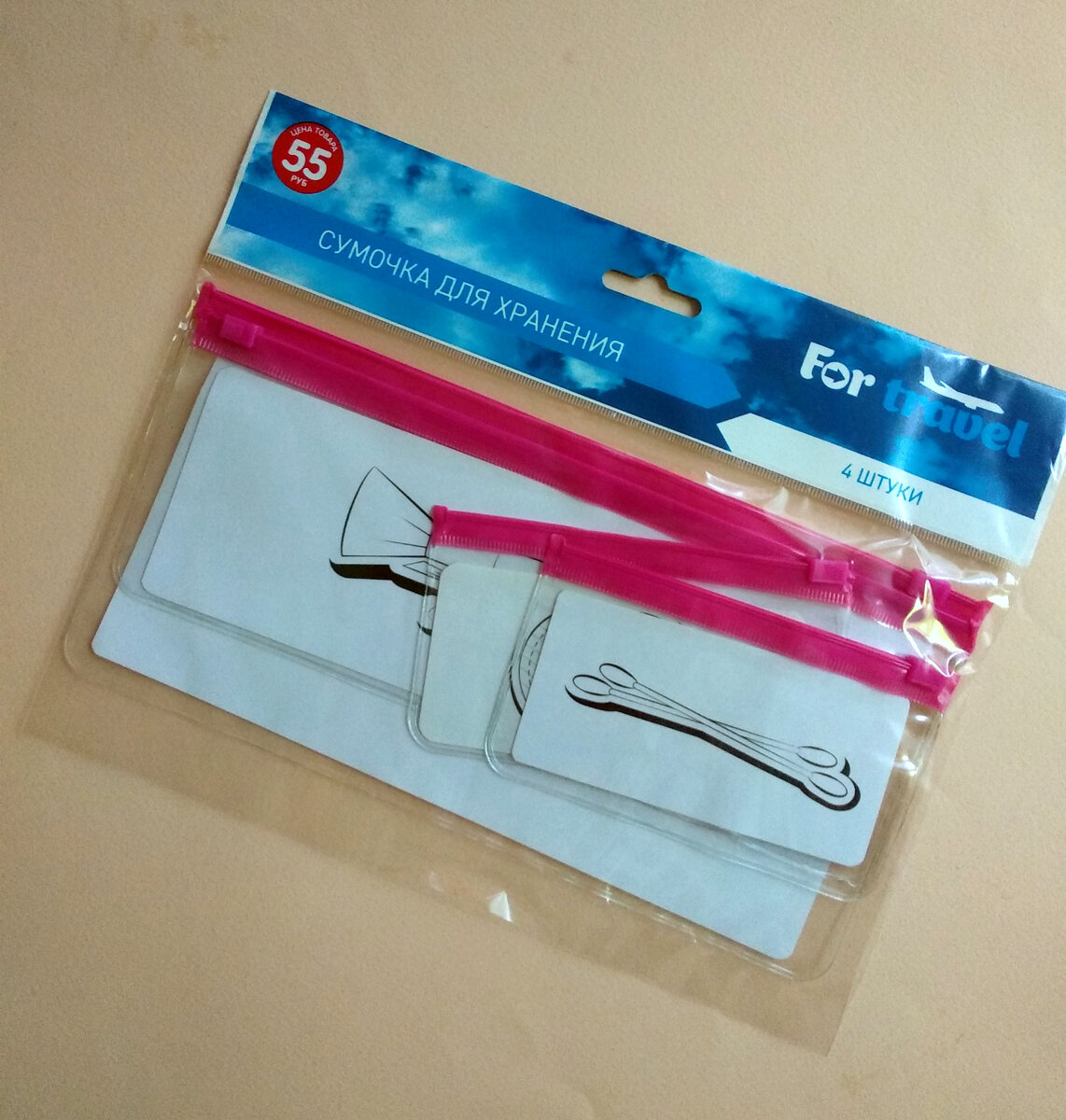 Сколько раз мне были нужны именно такие прозрачные маленькие сумочки для мелочей! У меня в хозяйстве есть подобные плотные пакеты для заморозки, но они больше по объему и потому не такие удобные. Эти же крошки косметички просто идеальны (хотя я бы сделала еще одну сумочку в комплект - покороче). В комплект входят 4 прозрачных пластиковых сумочки косметички. Производитель считает, что это "дорожный набор", но я купила 2 таких набора для использования дома. И нарадоваться на них не могу. Внутри каждой сумочки лежит вкладыш с нарисованным предметом, который предполагается в косметичке хранить. надо сказать, что размеры и правда подобраны хорошо: косметические кисти, зубная паста со щеткой, ватные диски и спонжи идеально входят в заготовленные для них сумочки. Замочки сумочек легко ездят и плотно закрываются. Почему эти косметички вызывают такой восторг у меня? Да потому что теперь я могу в них убирать на хранение или переносить кучу разных мелочей! Мягкая повязка убирающая волосы от лица