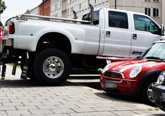 Как поступил владелец пикапа, когда его на парковке подпёрли две девушки на "жуке"